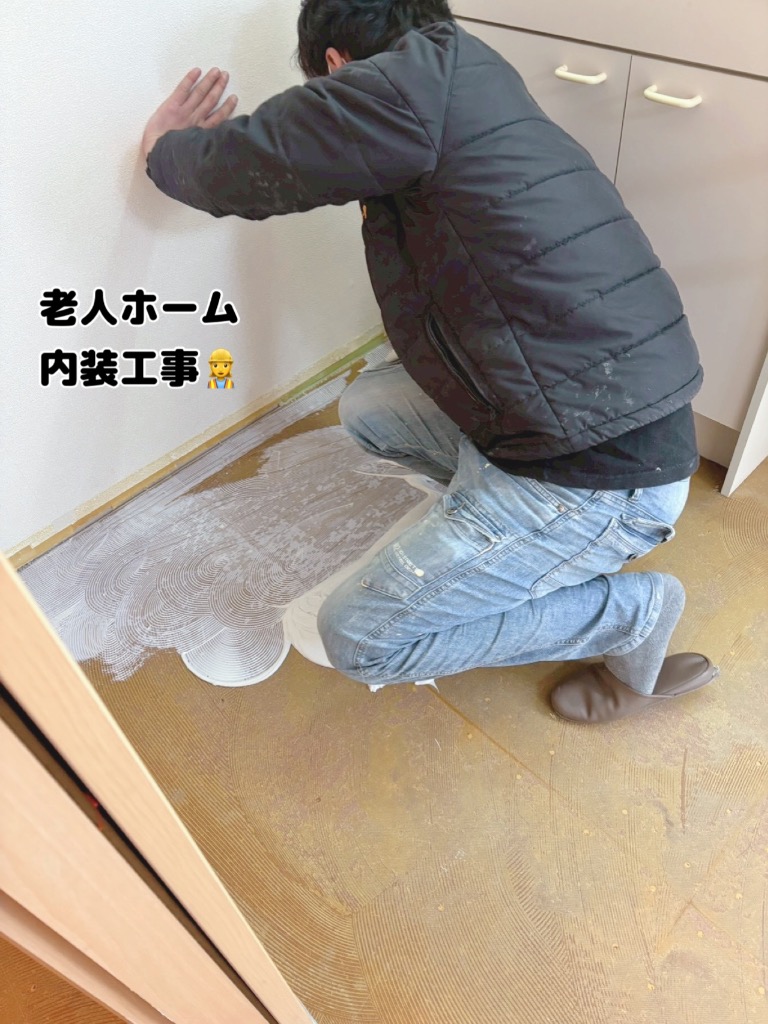 老人ホームの床工事作業中の社長と