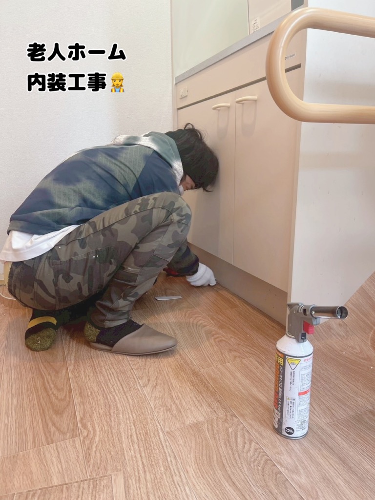 老人ホームの床工事作業中の社長と